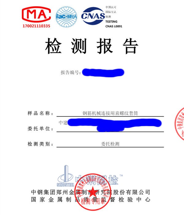 檢測(cè)單位:中鋼國(guó)檢(國(guó)家金屬制品質(zhì)量監(jiān)督檢驗(yàn)中心),有CMA、CNAS、橋隧、鐵路、公路檢測(cè)資質(zhì),全國(guó)各省市有辦事處,部分城市有實(shí)驗(yàn)室,鋼筋機(jī)械連接用直螺紋套筒檢測(cè)報(bào)告及其他工程材料檢測(cè)都可咨詢工程師。