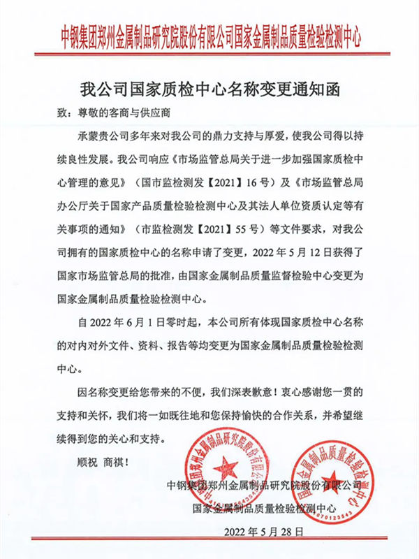 自2022年6月1日零時(shí)起,本公司所有體現(xiàn)國家質(zhì)檢中心名稱的對(duì)內(nèi)對(duì)外文件、資料、報(bào)告等均變更為國家金屬制品質(zhì)量檢驗(yàn)檢測(cè)中心。